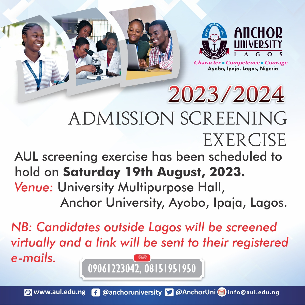On behalf of Anchor University, I wish you all the best as you embark on this screening exercise. Embrace the challenges, seize the opportunities, and let your passion for knowledge and personal growth shine through. We look forward to witnessing your remarkable potential unfold.