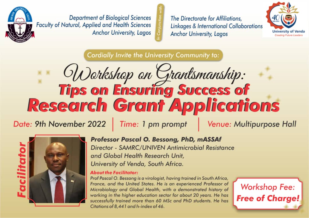 The Department of Biological Sciences, Faculty of Natural, Applied and Health Sciences Anchor University, Lagos in conjuction with The Directorate for Affiliations Linkages and International Collaborations, Anchor University, Lagos cordially invite the University Community to a workshop on grantsmanship with the theme Tips on Ensuring Success of Research Grant Applications. The program is facilitated by Professor Pascal O. Bessong, PhD, mASSAF.